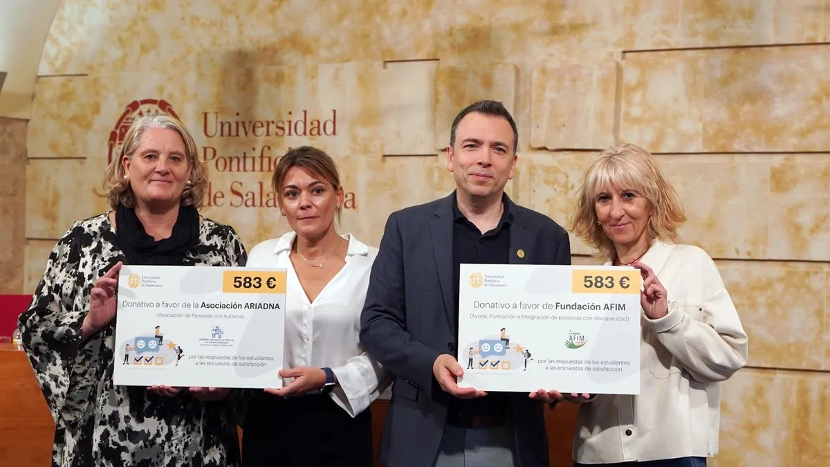 (UPSA).- El vicerrector de Ordenación Académica, Profesorado y Calidad de la Universidad Pontificia de Salamanca (UPSA), Francisco José Álvarez García, acompañado por la Adjunta al Rector para la Calidad, Sandra Marcos Ortega, ha entregado esta mañana sendos cheques por valor de 583 € a las entidades sin ánimo de lucro de Salamanca Fundación AFIM y Asociación ARIADNA. Con esta iniciativa, la Universidad pretende contribuir con la tarea desempeñada por ambas en favor de las personas con discapacidad y de las personas con autismo.