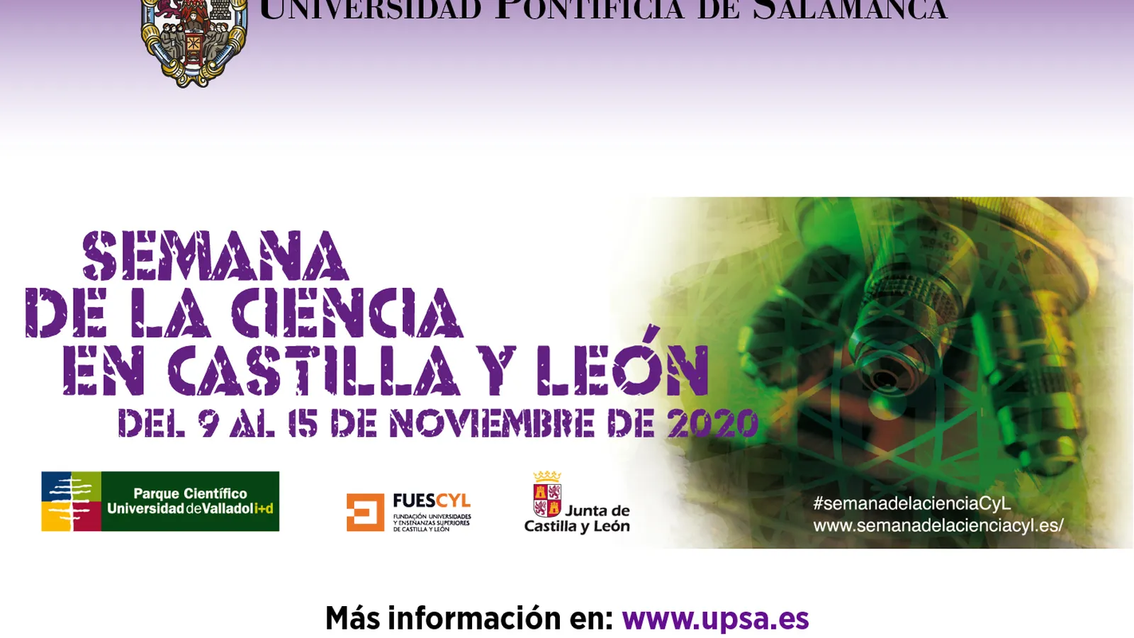 La Universidad Pontificia de Salamanca (UPSA) ha programado un total de 12 actividades virtuales en la XVIII Semana de la Ciencia de Castilla y León, que se celebrará entre el 9 y el 13 de noviembre. Las acciones, que se desarrollarán online, incluyen conferencias, talleres, presentación de resultados de investigación y demostraciones de diversas temáticas como psicología, educación, nuevas tecnologías y discapacidad.