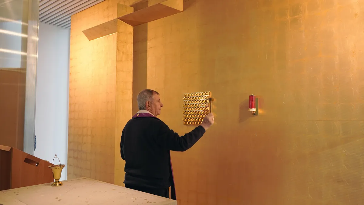 El espacio de la sala se resuelve con dos paredes de vidrio prensado, que forman distintos pliegues para orientar la mirada hacia el altar. Estos vidrios deforman las imágenes y difuminan los reflejos de oro que se vierten desde el retablo, consiguiendo con ello un espacio casi mágico.