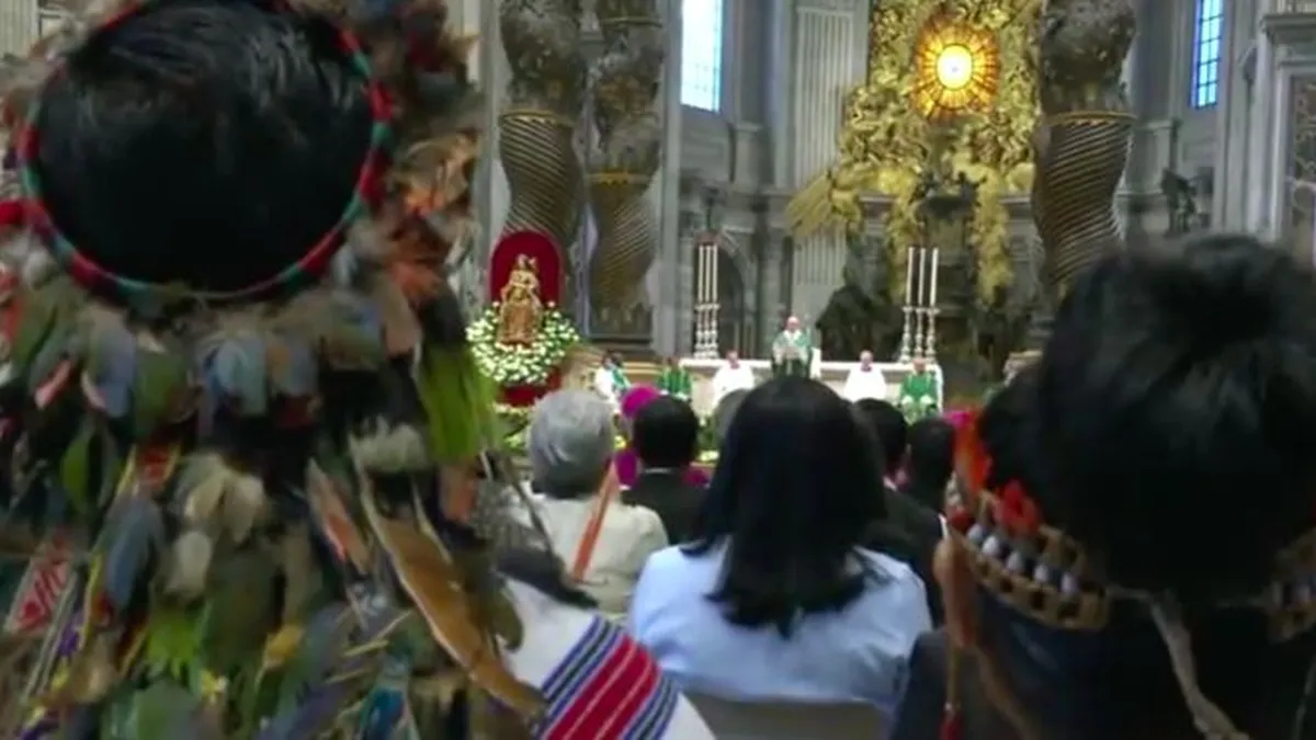 El segundo, con la emotiva procesión desde la basílica de San Pedro hasta el Aula Pablo VI en la primera jornada. Con los indígenas arropando al Papa, en una procesión en forma de barca. Francisco no presidía ni cerraba el camino, sino que iba junto al pueblo. Y es que, como no se cansa de repetir el Pontífice, los verdaderos pastores tienen que saber cuándo caminar delante y detrás de la gente, pero siempre dentro del Pueblo Santo de Dios.