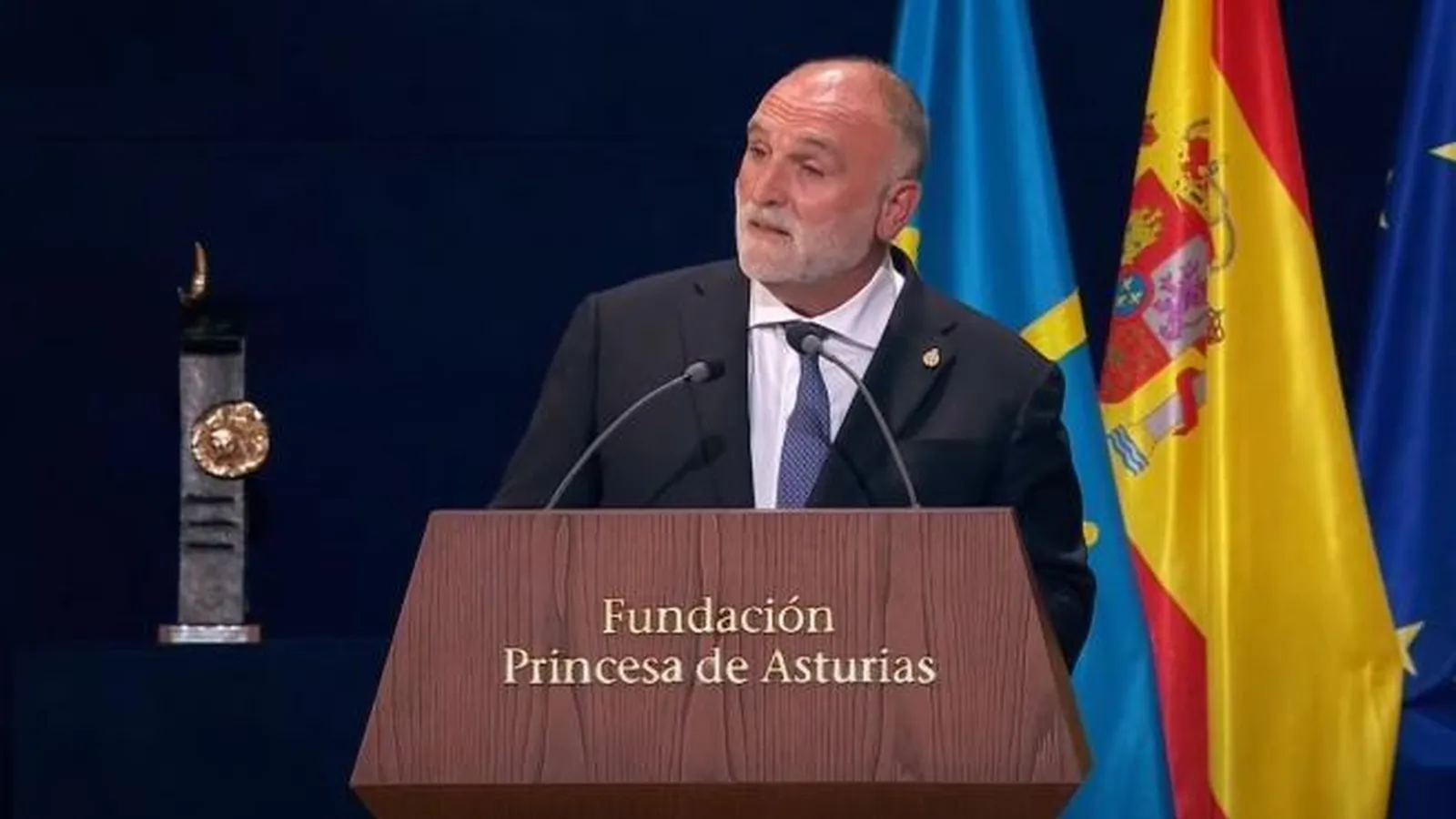 "La Humanidad, las personas sin voz y sin rostro, esas personas que parecen sombras en la niebla necesitan a personas que las cuiden. Necesitan a personas que las traten como personas. Esas personas no quieren nuestra limosna, quieren nuestro respeto y su dignidad. Y ese es el poder que tiene un plato de comida", dijo el cocinero y creador de la ONG World Central Kitchen durante su emotivo discurso de ayer en el teatro Campoamor de Oviedo.