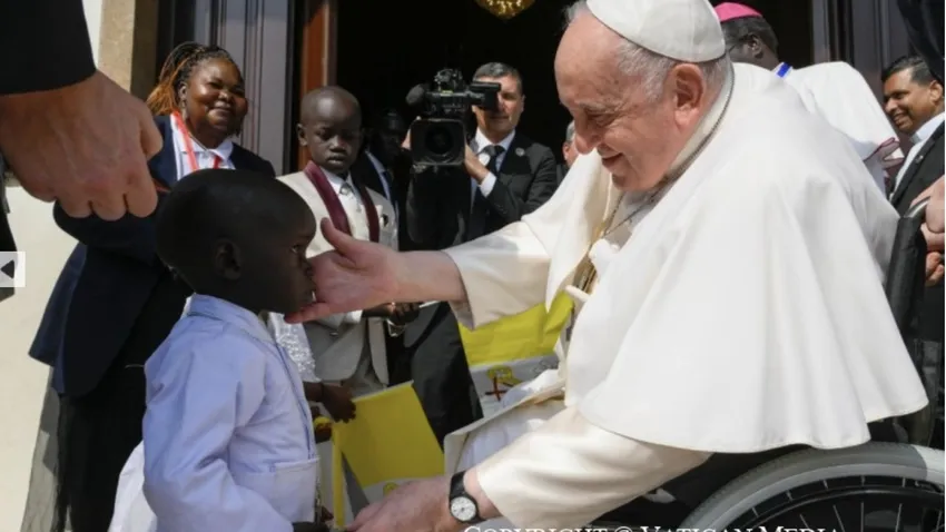 La imagen dará la vuelta al mundo (si es que el mundo quiere enterarse de que el Papa Francisco está en Sudán del Sur, que esa es otra historia): un 'joven Papa' (en Congo ya vimos a un 'pequeño cardenal') saludando a al anciano Bergoglio que, en silla de ruedas, respondía al gesto inclinando la cabeza, y acariciando la cara del pequeño. 'Dejad que los niños se acerquen a mí', que dijo el Maestro.