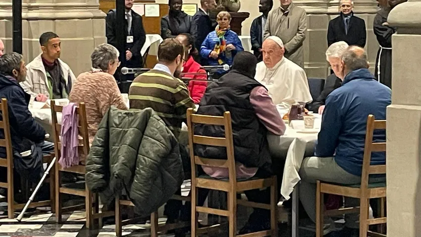 En la iglesia se instaló una gran mesa con 17 sillas, el papa se sentó en medio de las personas sin hogar y junto con arzobispo de Malinas-Bruselas, Luc Terlinden y Marie-Françoise Boveroulle, una de las responsables del Vicariato de Bruselas, encargada de la diaconía.