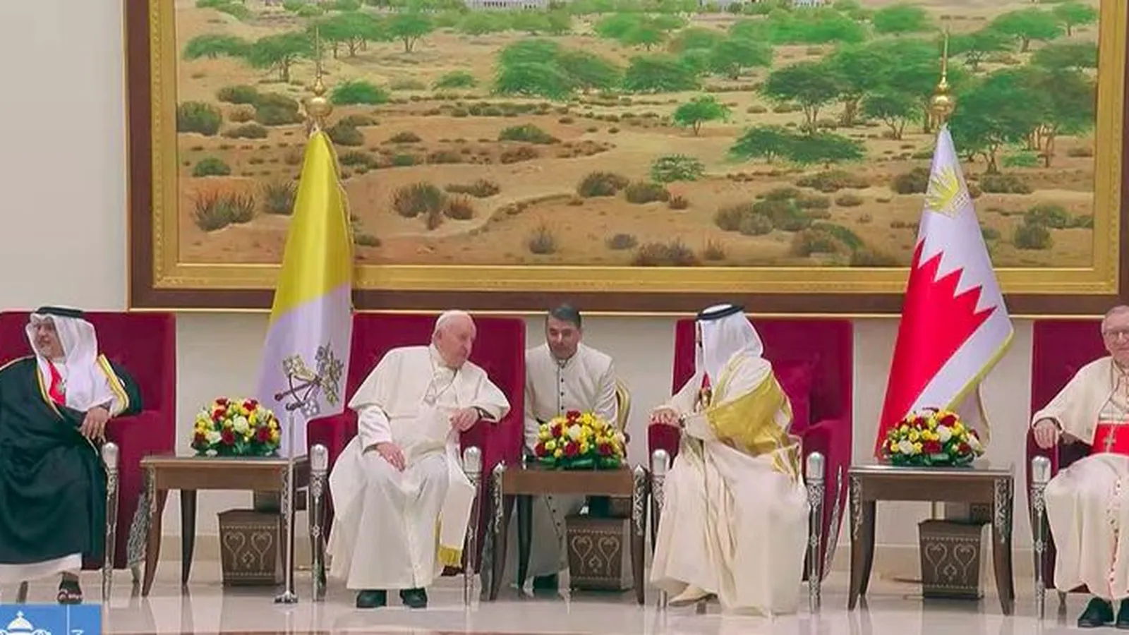 Al término de esta, el Papa y la realeza del país saludarán al Gran Imán de al-Azhar, Ahmad Muhammad Al-Tayyeb. A continuación, el Santo Padre se traslada en coche al Palacio Real de Sakhir para la visita de cortesía a Su Majestad el Rey de Bahrein, en una reunión privada a la que también asisten el Cardenal Secretario de Estado, Pietro Parolin; el Sustituto de la Secretaría de Estado,Edgar Peña Parra; Paul Richard Gallagher; el Nuncio Apostólico, Eugene Martin Nugent; y el Secretario de la Nunciatura Apostólica. Después, llegará el esperado primer discurso del Papa en Bahrein.