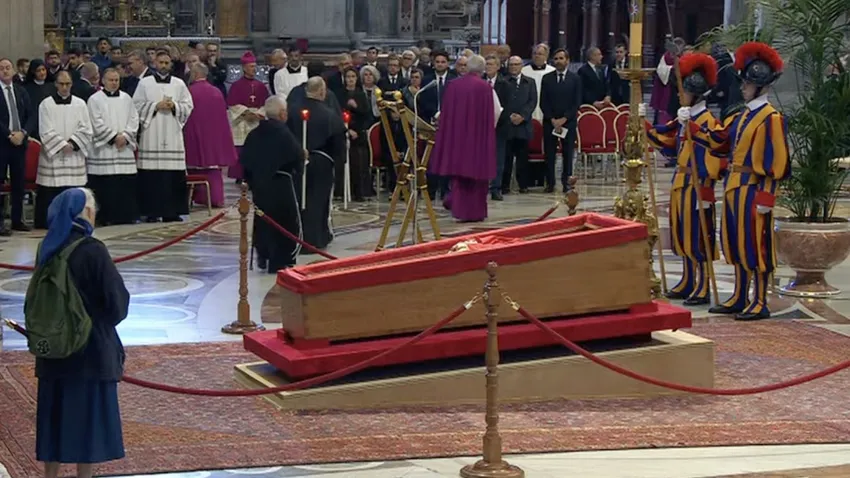 Poco después de que esta mañana se abriesen las puertas de la basílica de San Pedro para acoger los restos mortales del papa Francisco y dar paso a las 72 horas de velatorio público previo al funeral de este próximo sábado, 26 de abril, una riada de cardenales, obispos y eclesiásticos comenzaron al desfilar ante el sencillo féretro de madera.