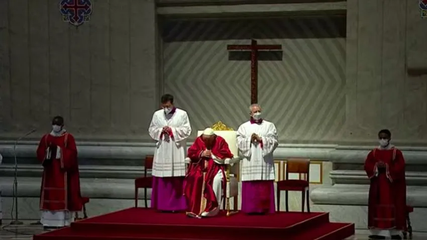 De pie, en el centro de la basílica, Bergoglio reflexionó en completo silencio tras una breve procesión en la que, bamboleándose notablemente, recorrió el pasillo central de la impresionante basílica de San Pedro. Posteriormente, siguió -como es costumbre- la Liturgia de la Palabra, con la lectura en latín de la Pasión de Cristo, tras la que se escuchó la homilía del predicador de la Casa Pontificia, Raniero Cantalamessa.