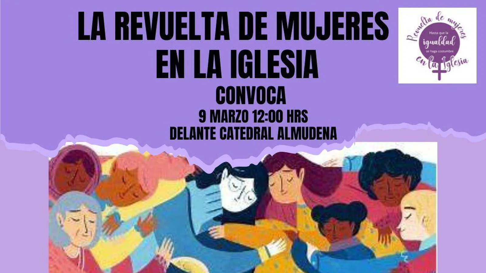 El próximo domingo 9 de marzo a las 12:00 horas, la Revuelta de Mujeres de la Iglesia de Madrid, este año bajo el lema “Creyentes y feministas por una iglesia en igualdad”, se concentrará frente a la catedral de la Almudena para continuar reivindicando la igualdad de las mujeres en una Iglesia que las discrimina por su condición de mujer. De esta manera, como cada año, las mujeres de la Revuelta enmarcan su protesta en las celebraciones del 8M, Día Internacional de la Mujer.