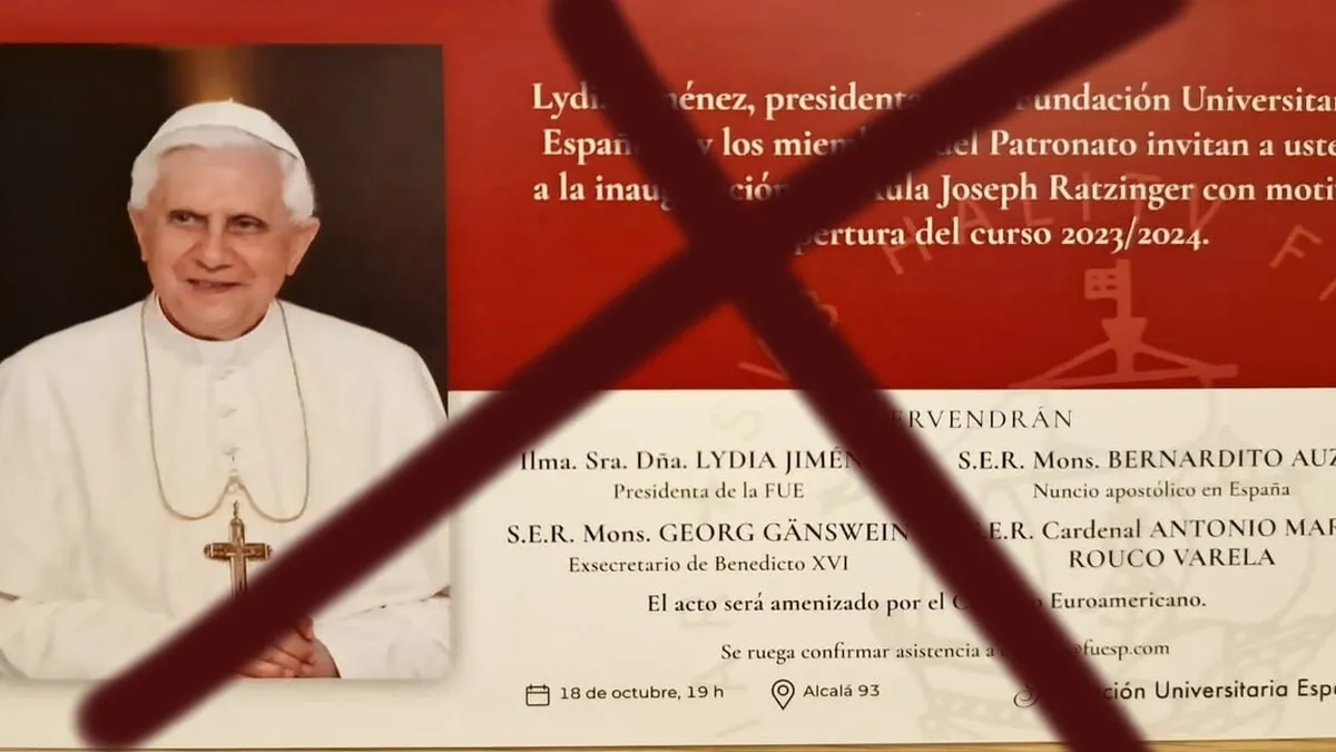 Finalmente, Georg Ganswein no vendrá a Madrid. A la hora de comer, un lacónico correo enviado por la Fundación Universitaria Española apuntaba que "El patronato de la Fundación Universitaria Española lamenta comunicar que el acto de apertura de curso 2023/2024 anunciado para este miércoles 18 de octubre ha sido suspendido por motivos de organización".