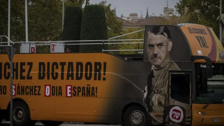"Pedro Sánchez traidor", "Pedro Sánchez Odia a España (PSOE)", "Paremos el Golpe de Pedro Sánchez". El lobby ultra Hazte Oir ha hecho de la ley de amnistía y de la investidura como presidente del Gobierno un nuevo símbolo para la agitación. Y, para lograrlo, ha vuelto a sacar a la calle uno de sus iconos: el famoso autobús naranja, que en su día sirvió para atacar a los menores trans o el feminismo, en esta ocasión convenientemente tuneado con una imagen del presidente del Gobierno en funciones, ataviado como Adolf Hitler. Con bigote y todo.