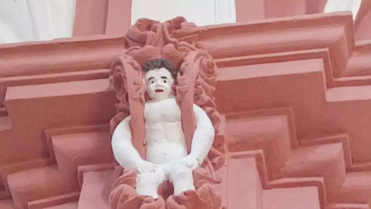 El restaurador ha coloreado la abundante cabellera de estos amorcillos e igualmente ha pigmentado las cejas, resaltado los ojos y retocado de un rojo intenso los labios de todas y cada una de las figuras moldeadas en yeso de color blanco.