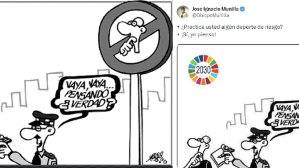 "¿Practica usted algún deporte de riesgo?" "¡Sí, yo pienso!". El obispo de Orihuela-Alicante, José Ignacio Munilla, ha utilizado una viñeta publicada por el genial Forges el 9 de septiembre en El País para atacar la Agenda 2030. "Una viñeta falsa de Forges; manipulada, además, con un mensaje fraudulento que traiciona las ideas que siempre defendió el humorista", tal y como denuncia la familia del artista en declaraciones a RD.