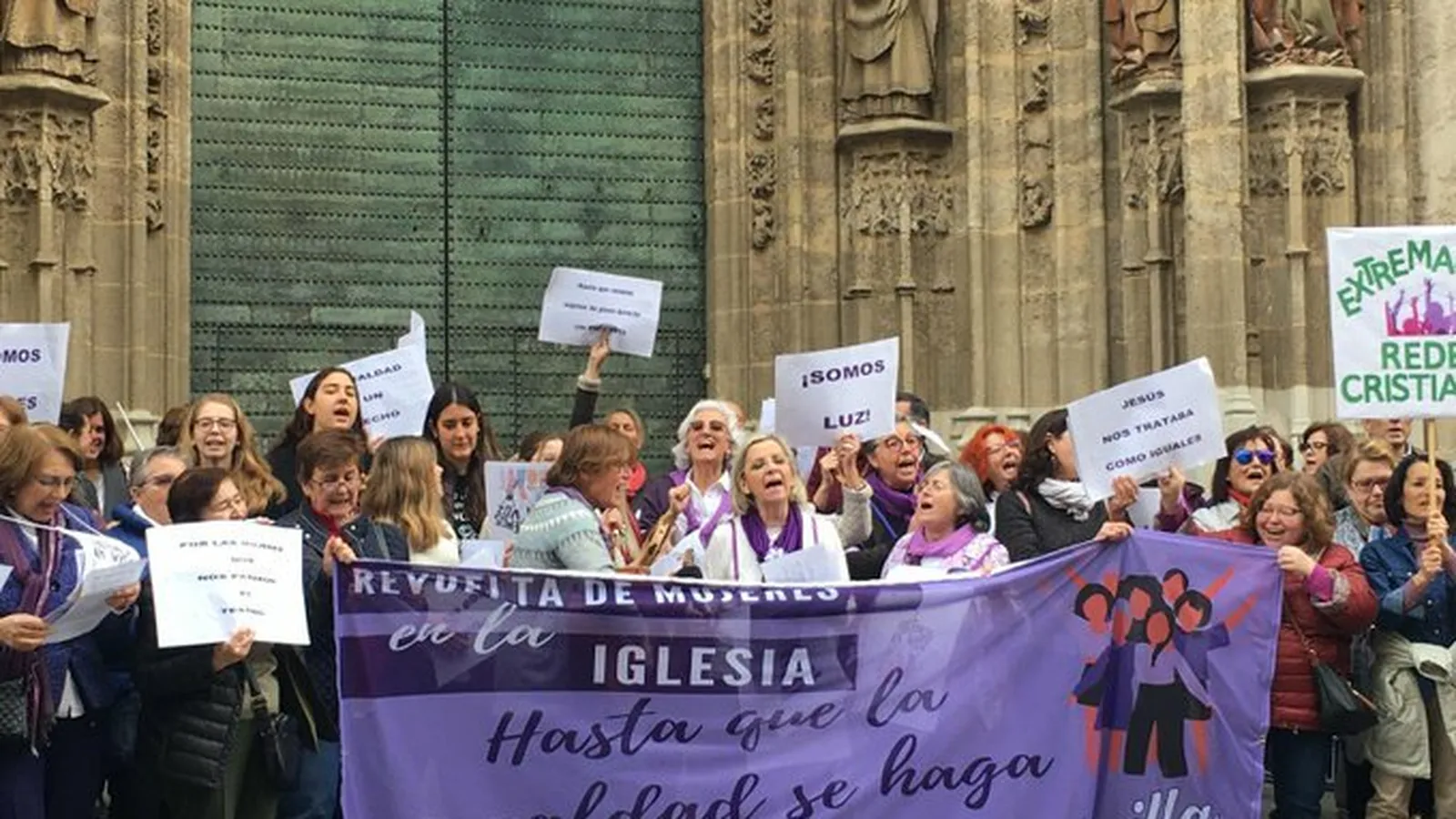 Esta concentración, que ha arrancado a las 12,00 horas en la Puerta del Bautismo de la Catedral de Sevilla, ha reclamado "más voz y voto" en una Iglesia que las "invisibiliza", les "impide estar donde se toman decisiones" y no les da el lugar "que las mujeres están tomando ya en la sociedad civil".