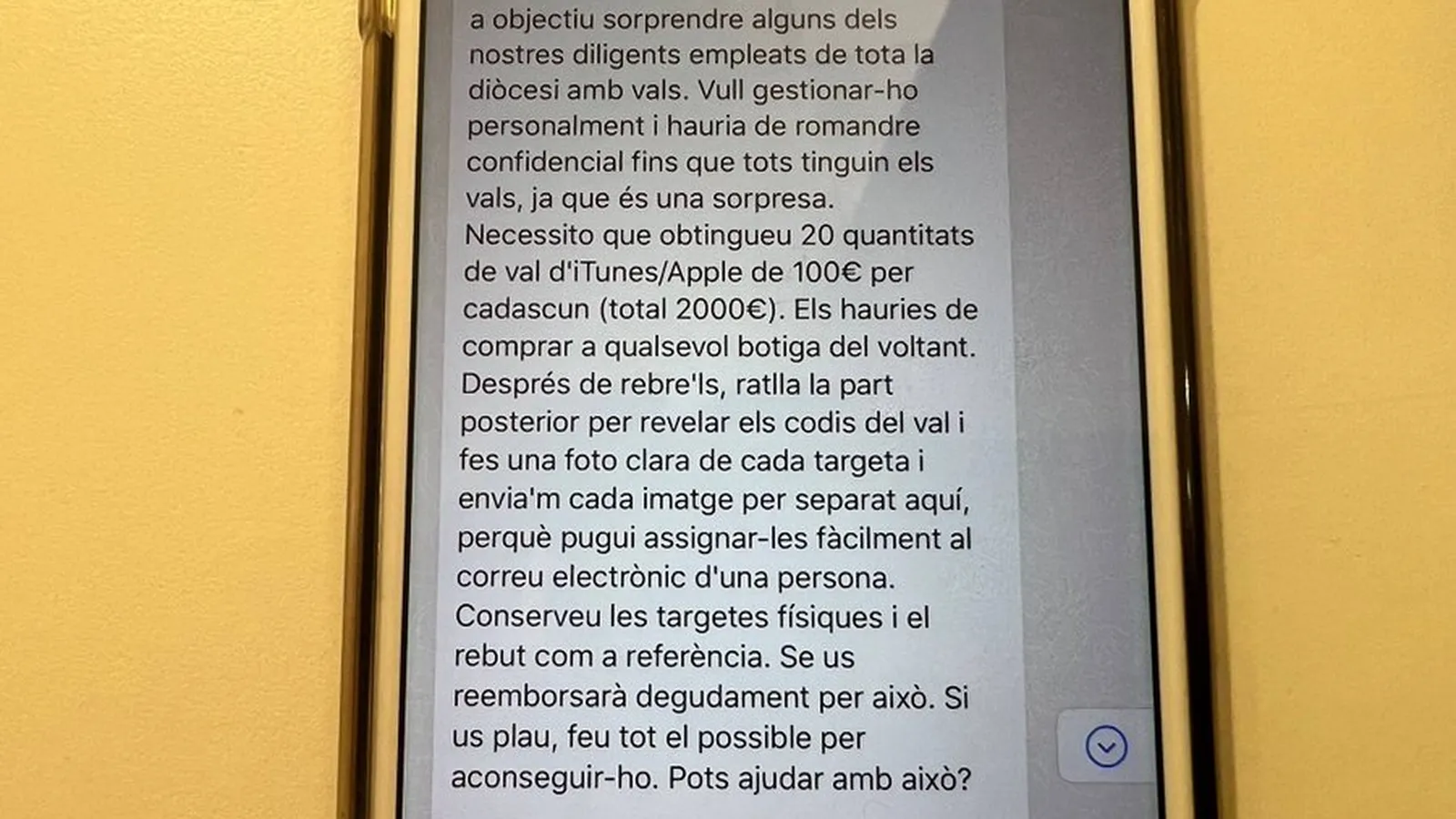 "Esto es lo que quiero que hagas por mí, estoy trabajando en incentivos y tenía como objetivo sorprender a algunos de nuestros diligentes empleados de toda la diócesis con vales. Quiero gestionarlo personalmente y tendría que mantenerse confidencial hasta que todos tengan los vales, ya que es una sorpresa. Necesito que obtengáis 20 cantidades de vale de iTunes/Apple de 100 euros por cada uno (total 2.000 euros)", decía el segundo correo electrónico que recibían.