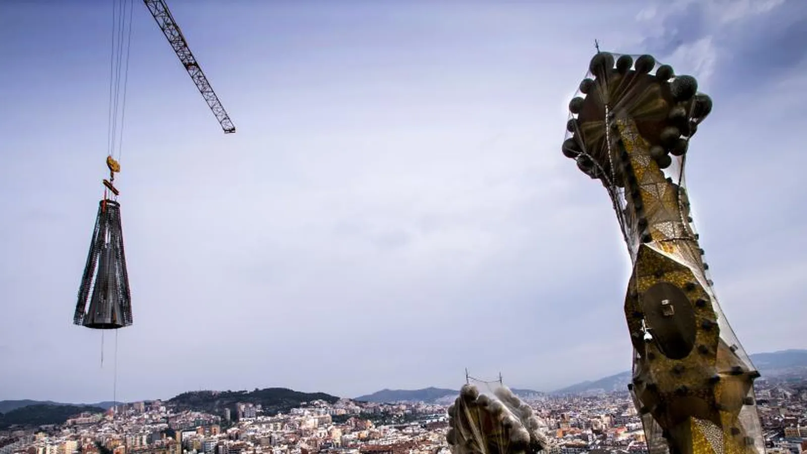Según ha informado este jueves la Junta Constructora de la Sagrada Familia, la pieza se ha colocado ya ornamentada con 'trencadís' (azulejos rotos típicos en las obras de Antoni Gaudí) de colores azules, que se va difuminando hasta convertirse en blanco.