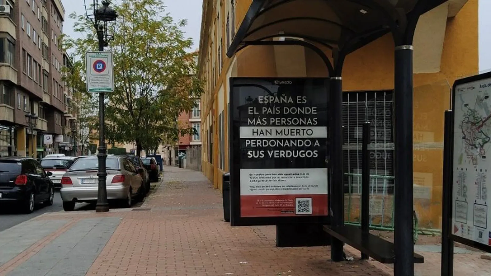 En las marquesinas se puede leer la frase "España es el país donde más personas han muerto perdonando a sus verdugos" y muestran la cifra de "los 2.053 fieles cristianos asesinados por su fe entre 1931 y 1939" que se recuerdan cada 6 de noviembre en la fiesta de los Santos Mártires de la Persecución Religiosa del siglo XX en España.