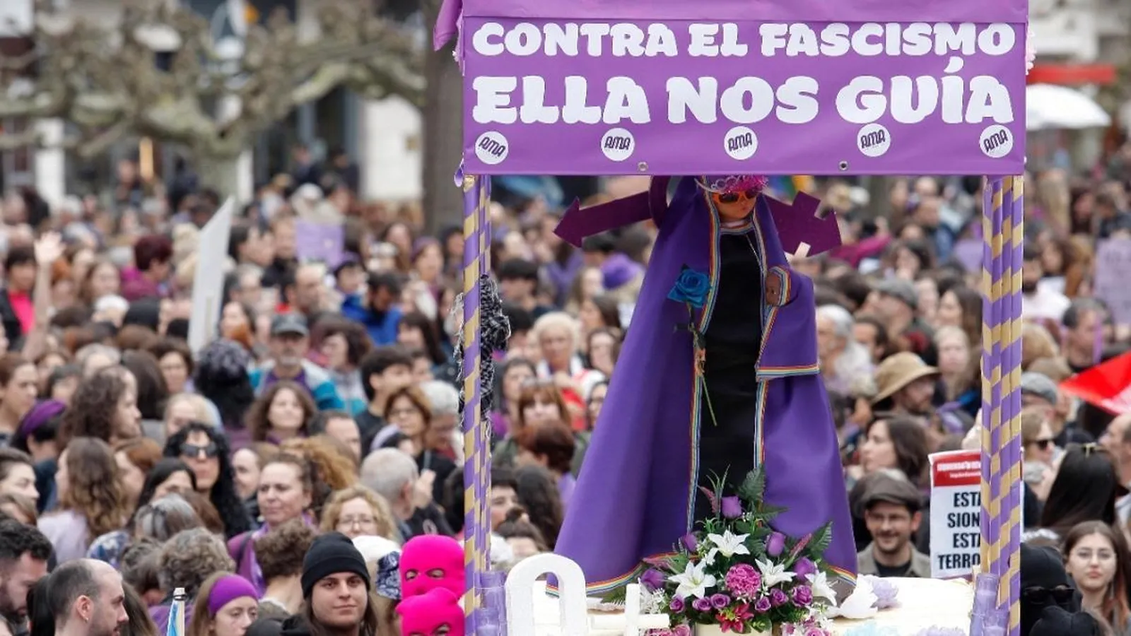 El Juzgado de Instrucción número 4 de Gijón ha acordado abrir diligencias por un posible delito de discriminación tras la denuncia presentada por Abogados Cristianos contra los organizadores de la manifestación por el 8M en Gijón / Xixón en la que se exhibió una Virgen de Covadonga 'queer'.