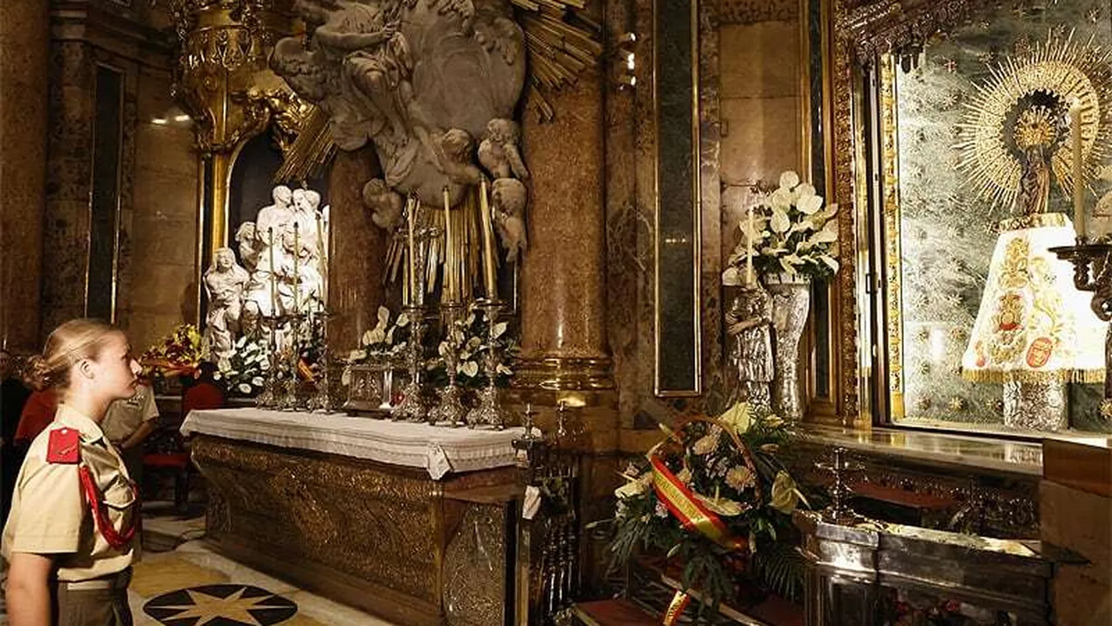 La princesa Leonor ha participado este viernes en la ofrenda a la Virgen del Pilar que los cadetes de nuevo ingreso de la Academia General Militar (AGM) de Zaragoza protagonizan todos los años para invocar su protección, un homenaje a la patrona de la ciudad y de la Hispanidad que se celebra en la víspera de la jura de bandera de la promoción.