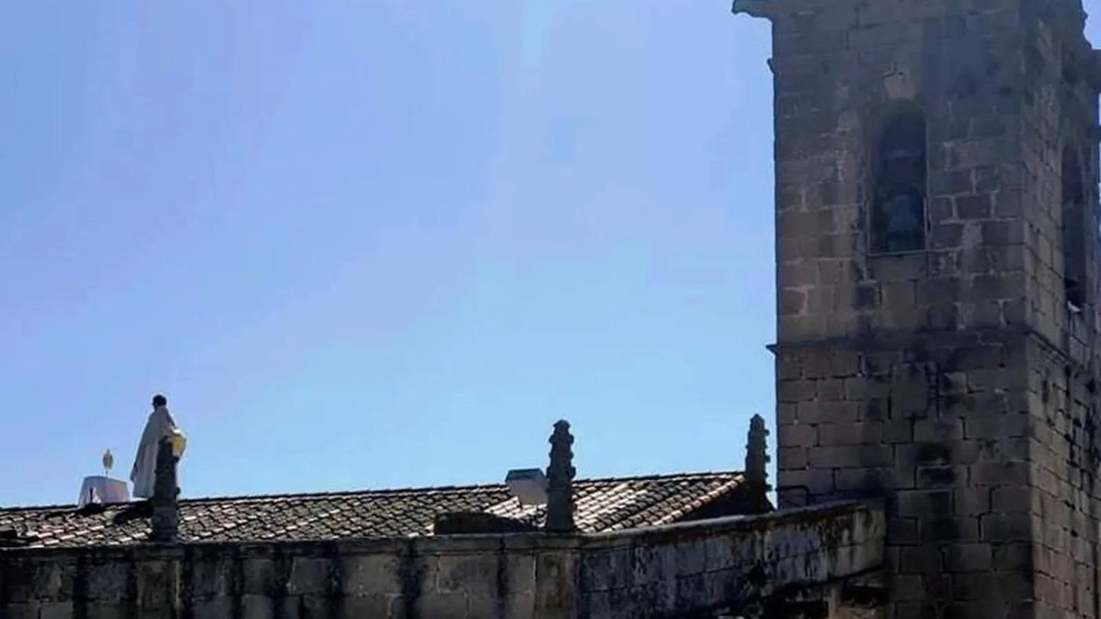 Me dicen q es el párroco de Arroyo de la Luz (Cáceres), dando misa en el tejado de la parroquia. Su pueblo ha sido fuertemente azotado por el #COVID2019 , 9 fallecidos y decenas de afectados. El párroco se arriesga a una caída por sus feligreses, algo tenía q hacer el hombre. pic.twitter.com/7lcK4s823u