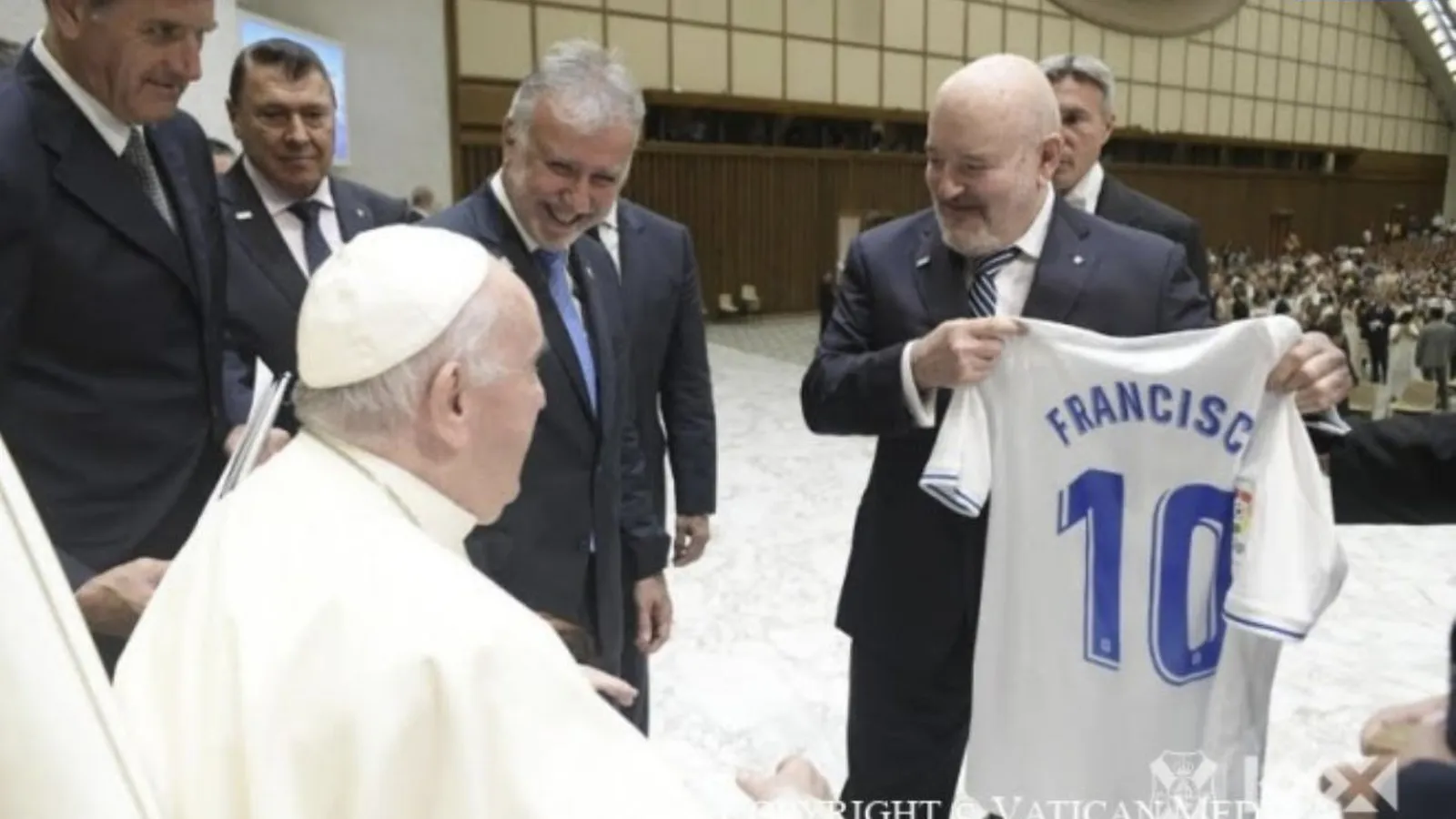 Ha sido, sin duda, "uno de los momentos más emotivos de los primeros 100 años" del CD Tenerife. Esta mañana, tras la catequesis de la audiencia general, el Papa ha saludado a una representación del equipo tinerfeño, encabezada por su presidente Miguel Concepción, y, entre otros, el presidente del Gobierno de Canarias, Ángel Víctor Torres, y el del Cabildo de Tenerife, Pedro Martín.