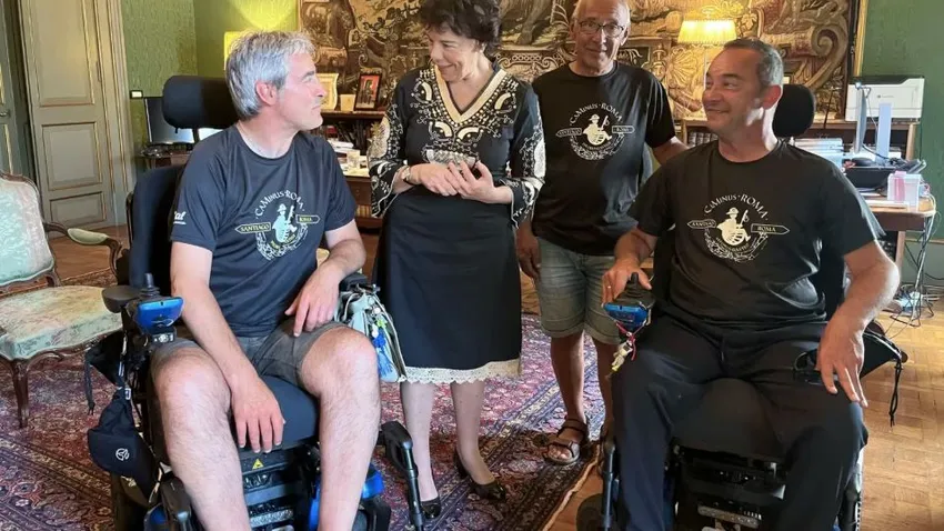 Rubén Zulueta, José Fernández y Antonio González fueron recibidos este martes en la Embajada de España ante la Santa Sede por la embajadora Isabel Celaá, a quien explicaron el proyecto de su fundación, 'CaMinus', y comentaron las anécdotas de un viaje que concluyó este lunes con su llegada a Roma.