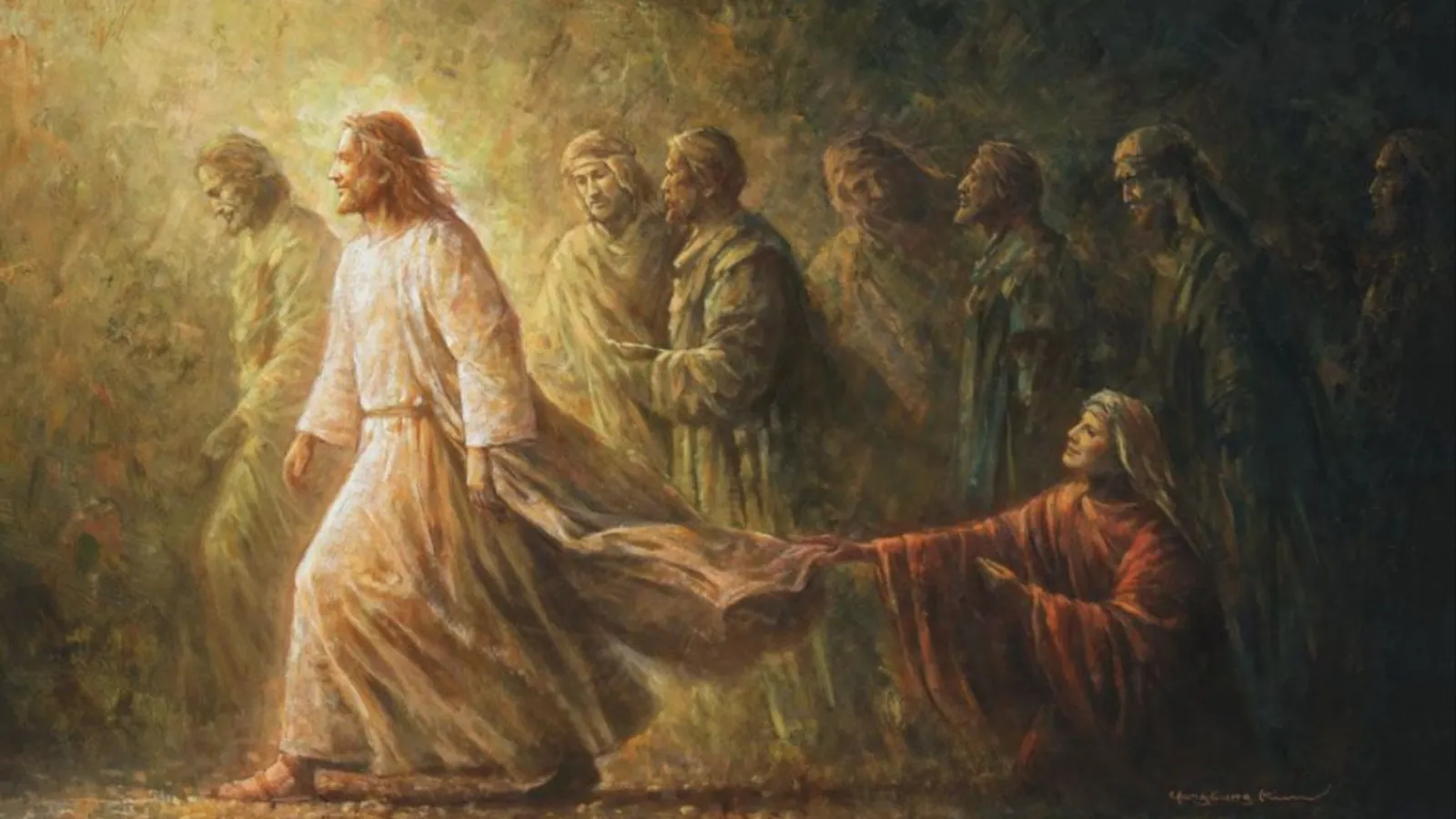 Jesús emprende el camino, rodeado por una multitud, dentro de la cual se encontraba una mujer que sufría hemorragia de sangre por 12 años. Ella se acerca a Jesús pensando que con sólo tocarlo podrá ser curada, y así sucede. Jesús siente que una fuerza curativa sale de él.