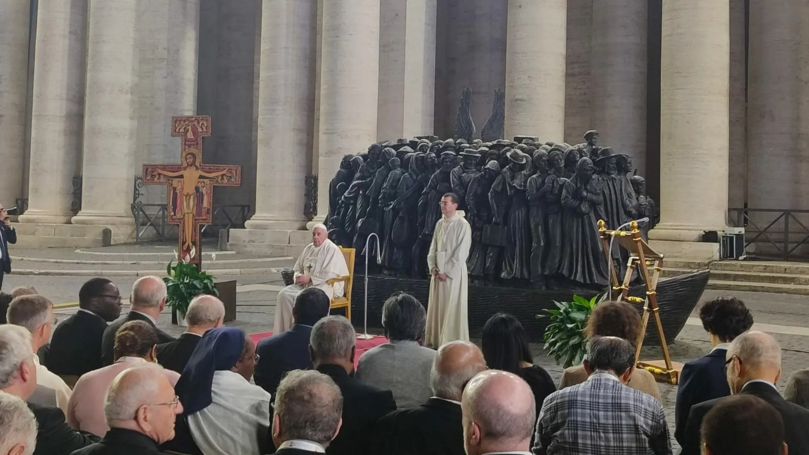 Nunca sabremos agradecer lo suficiente a san Lucas por habernos transmitido esta parábola del Señor (cf. Lc 10,25-37). Esta parábola también está en el centro de la Encíclica Fratelli tutti, porque es una clave, yo diría la clave para pasar de un mundo cerrado a un mundo abierto, de un mundo en guerra a un mundo en paz. Esta tarde la hemos escuchado pensando en los migrantes, a quienes vemos representados en esta gran escultura: hombres y mujeres de todas las edades y procedencias.