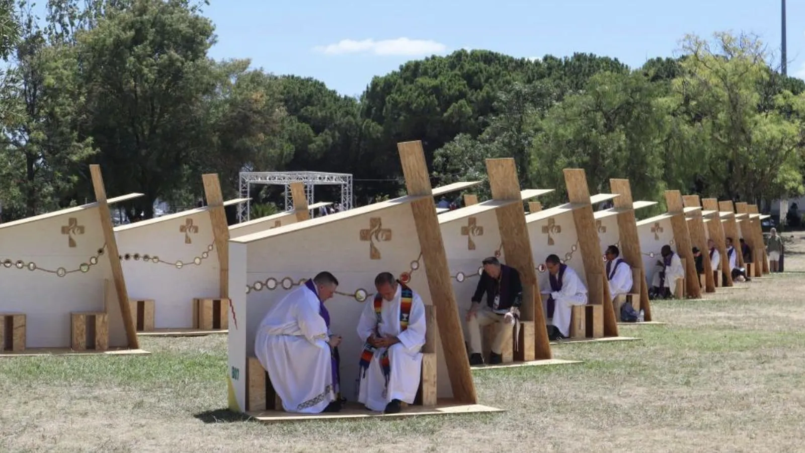 Decenas de jóvenes hacen cola bajo el sol, divididos en filas según el idioma en el que quieran confesarse, para acceder a las cabinas -construidas por reclusos-, muy diferentes de los tradicionales confesionarios donde suelen purgar sus pecados en parroquias o iglesias.