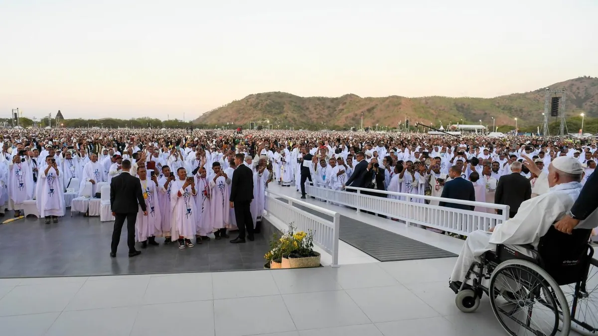 Una marea humana de cerca de 700.000 personas, casi la mitad de la población de Timor Oriental, asistió a la misa que presidió el Papa en la explanada de Taci Tolu, que vibró con los mensajes que les lanzaba Francisco, quien, antes de darles la bendición, pronunció unas palabras que eran improvisada, sí, pero que se veía que habían sido pensadas antes. Una enigmática advertencia que vino precedida de su admiración por la juventud de una nación que no quiere perder sus raíces.