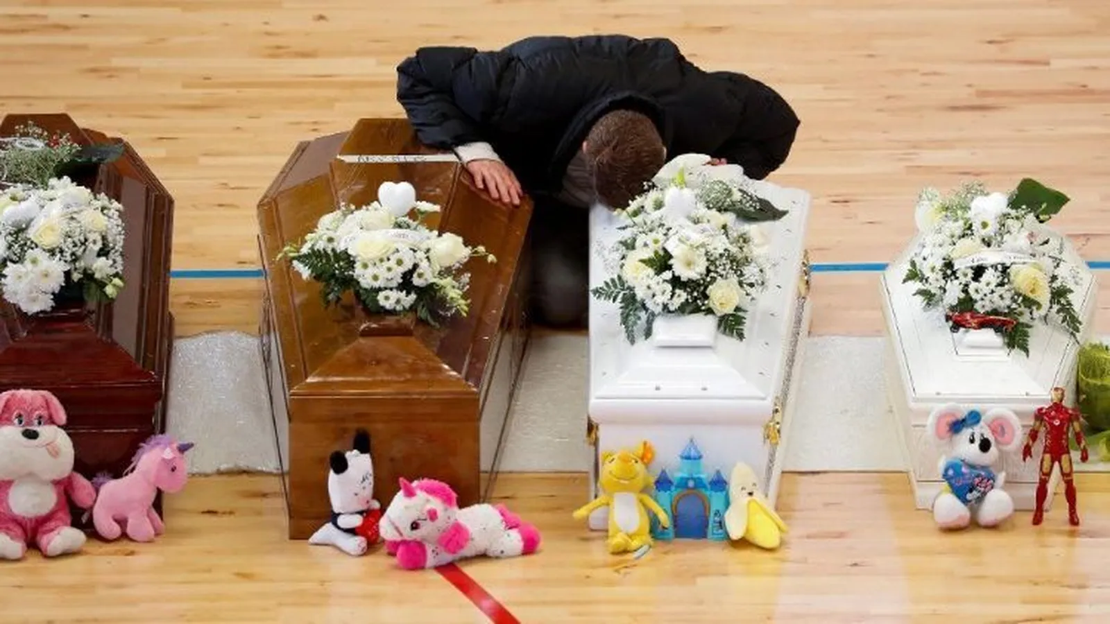 Sesenta y seis ataúdes se alineaban sobre el parqué de la estructura habitualmente utilizada por los crotonenses para competiciones de baloncesto y otros eventos artísticos y deportivos. Algunos son blancos y están rodeados de peluches, lo que indica la presencia de cadáveres de niños. Como el pequeño ataúd con las iniciales "KR46M0" estampadas, donde el 0 indica que el niño colocado allí -la víctima número 46- no tenía ni un año. Encima se colocó un coche de policía, mostrando las condolencias del cuerpo de policía también comprometido en estas horas de ayuda.