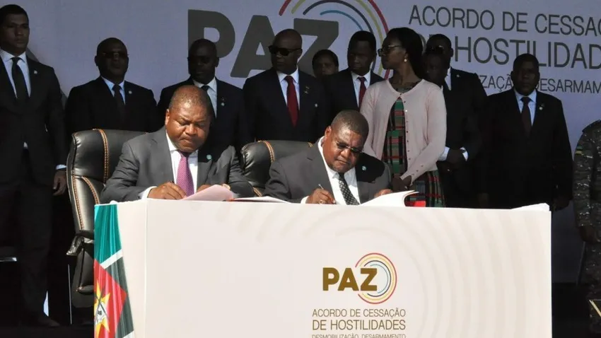 El presidente de Mozambique, Filipe Nyusi, y el líder de la opositora Resistencia Nacional Mozambiqueña (Renamo), Ossufo Momade, firman hoy un acuerdo de paz definitivo, solo cinco días después de que las dos partes rubricasen un cese de hostilidades.