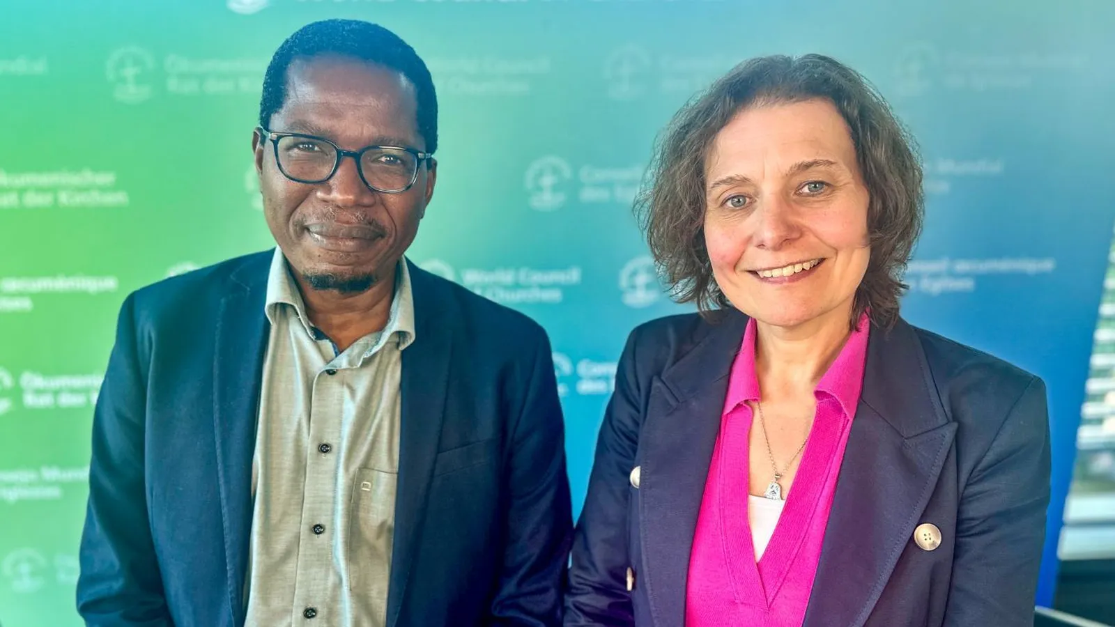 El reverendo dr. Kenneth Mtata, director del programa de Testimonio Público y Diaconía del Consejo Mundial de Iglesias (CMI), entrevista a Mirjam 't Lam, directora ejecutiva de Oikocredit, en el Centro Ecuménico de Ginebra