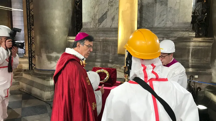 Coincidiendo con las celebraciones de Semana Santa, que este año se han visto muy limitadas por el confinamiento por el coronavirus, el arzobispo y el rector de la catedral, Patrick Chauvet, presidieron una ceremonia íntima de veneración a la corona de espinas, reliquia salvada en el fuego del 15 de abril de 2019.