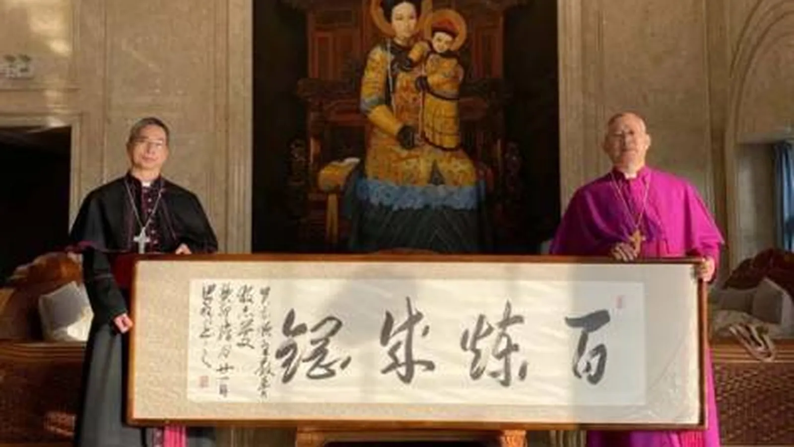 Monseñor Zhan, obispo de Mindong, le dio la bienvenida dedicándole una inscripción