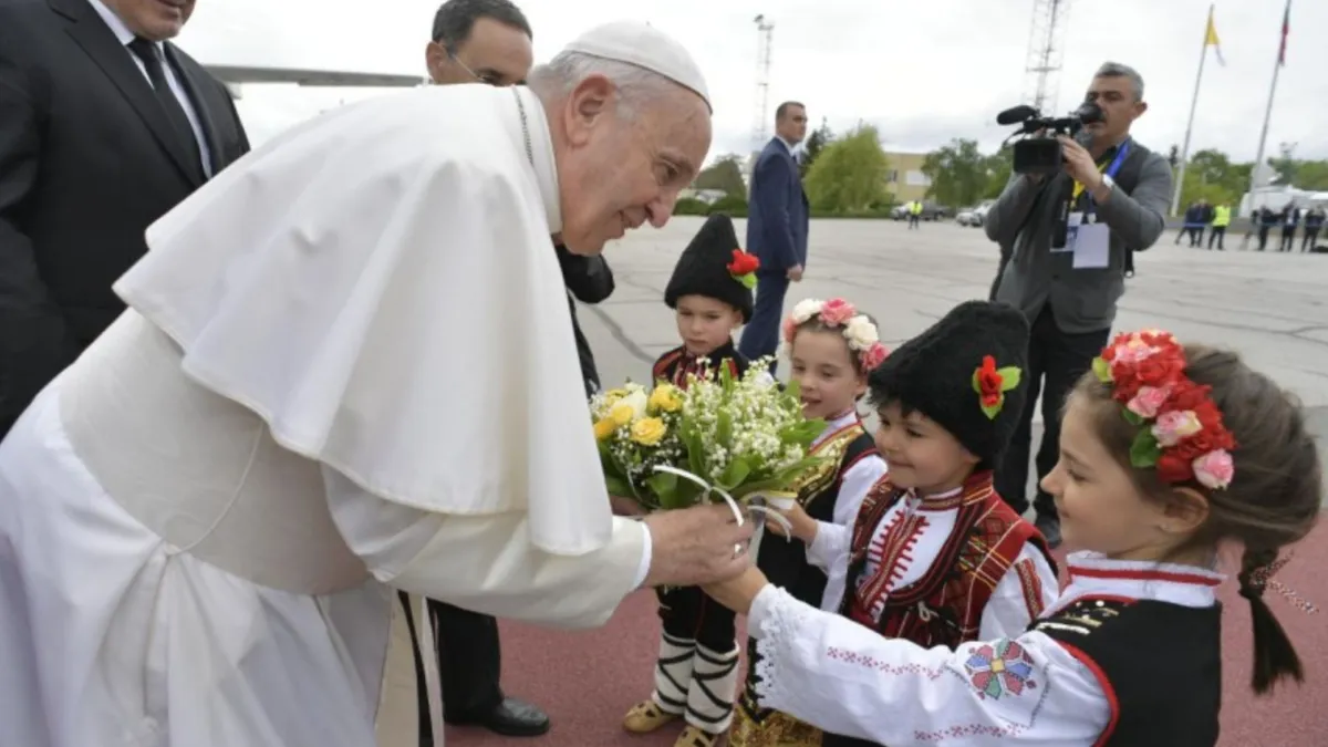El avión del Papa Francisco aterriza en Sofía, capital de uno de los países periféricos de Europa. Al pié de la escalerilla, le acoge el Primer ministro de Bulgaria, Boyko Borisov y cuatro niños, ataviados con los típicos trajes tradicionales, le ofrecen flores al Pontífice. Tras los saludos protocolarios, el Papa, acompañado del primer ministro, se dirige a la sala vip del aeropuerto, para un breve encuentro privado.