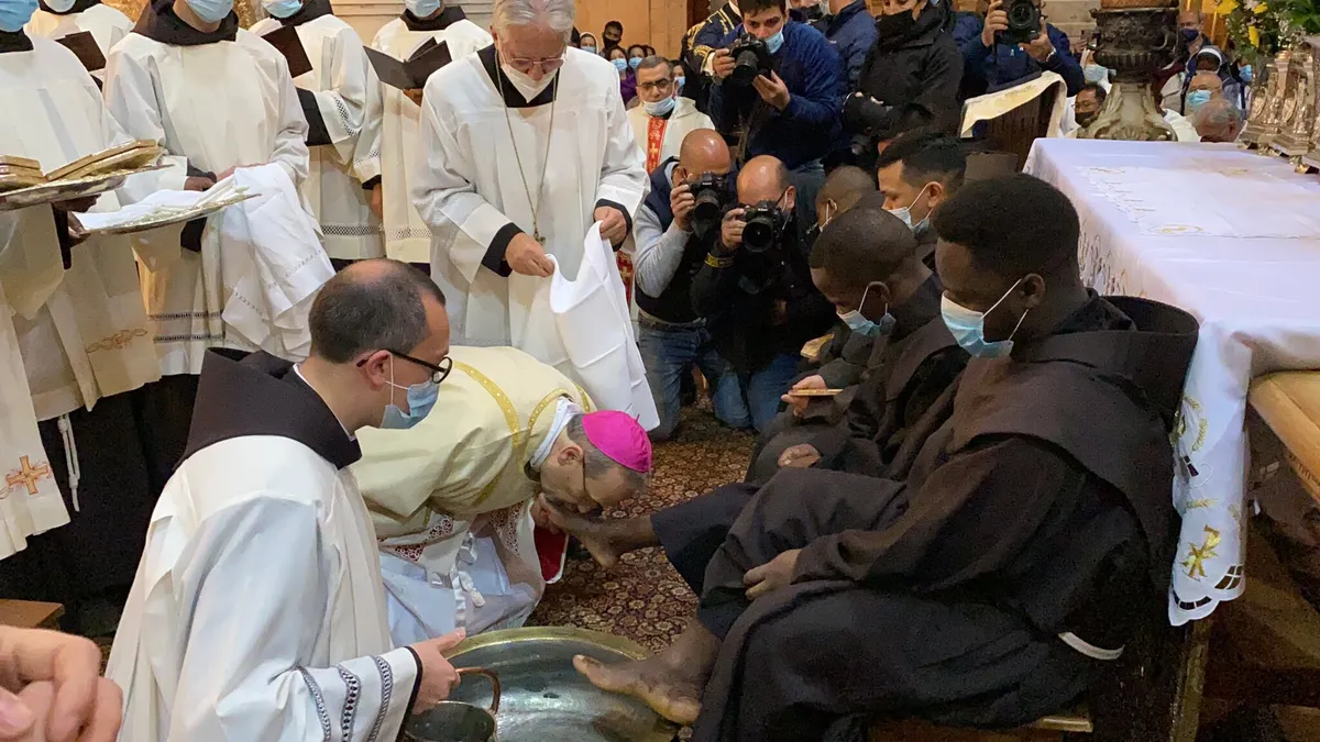 Pizzaballa lava los pies a franciscanos en un Santo Sepulcro semivacío por la ausencia de turistas