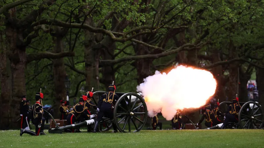 Desde el céntrico parque de Green Park, la Tropa Real de Artillería a Caballo disparó 41 salvas de cañón, como es habitual en el cumpleaños del jefe de Estado o de momentos destacados en el Reino Unido.