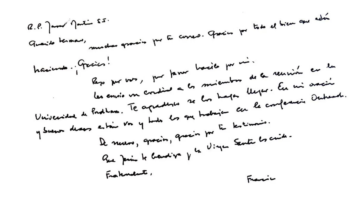 “Querido hermano. Muchas gracias por tu correo. Gracias por todo el bien que estás haciendo. ¡Gracias! Rezo por vos, por favor hacélo por mí”, le escribe el Pontífice argentino a Martin, S.J., el editor de Outreach, en donde ha aparecido publicada la carta manuscrita del Papa, que termina con un “De nuevo, gracias, gracias por tu testimonio".