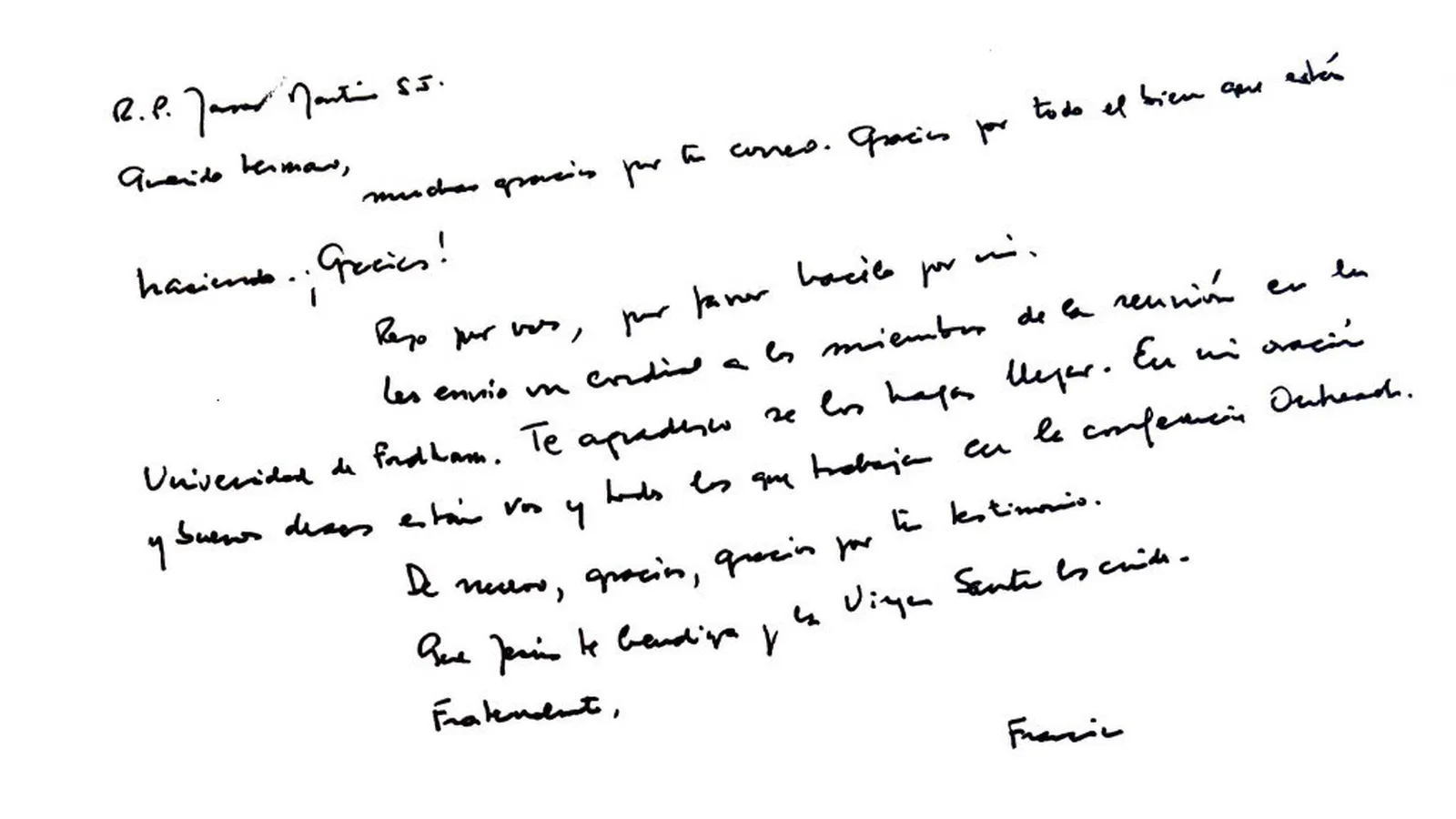 “Les envío un cordial saludo a los miembros de la reunión en la Universidad de Fordham. Te agradezco se los haga llegar. En mi oración y buenos deseos están vos y todos los que trabajan en la Conferencia Outreach”.