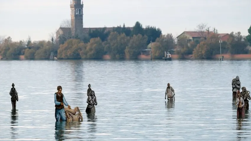 Las figuras, pintadas por el verdulero local Francesco Orazio, fueron puestas en postes de madera. Sus pies se ven solo un par de horas al día, cuando la marea baja.