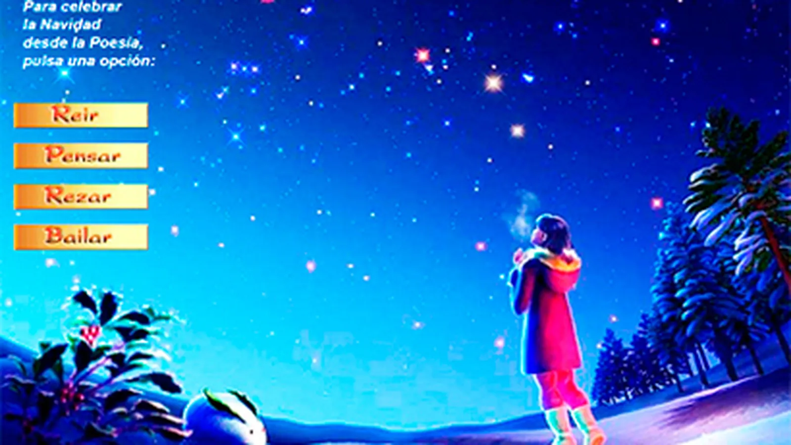 La imagen de la muchacha abierta al misterio de la noche que preside el trabajo de hoy corresponde a la página índice de "Reír, Pensar, Rezar, Bailar la Navidad". Las alegres ramas de "Nido de Poesía" reservadas para versos de Navidad contienen ya, diríamos, 40 poemas, 40 avecicas batiendo alas para volar al hombro de hermanos y hermanas que siguen la estrella. Para activar las cuatro opciones de la joven frente al universo, pulsar aquí.
