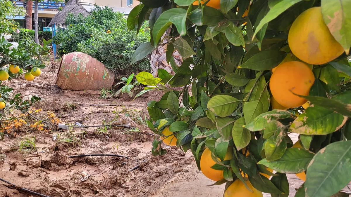 En la foto dos elementos que hoy son protagonistas de Valencia, las naranjas y el barro.