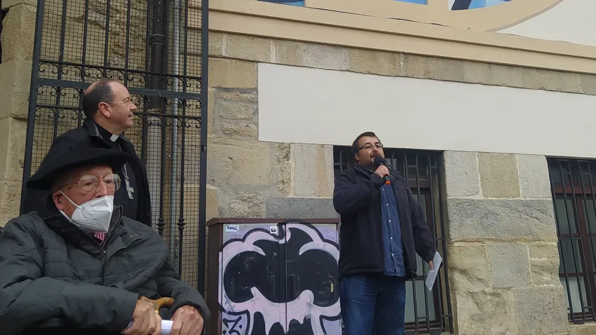 El Obispo de Vitoria, monseñor Elizalde, enlazando con la inauguración de un hito en la calle Adriano VI en el que se recuerdan los 500 años de su elección y la noticia que le fue comunicada de paso por esta ciudad. Elizalde encuentra en el mural y en el nuevo hito en la ciudad una clara mirada al pasado, al presente y al futuro con fe y esperanza.