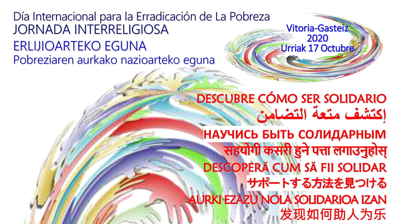 Este año 2020 la pandemia está agravando aún más si cabe esta Pobreza, y ha condicionado la vida de todos. Evitar las grandes concentraciones es hoy un gesto de respeto y de responsabilidad para con los demás. Por eso, el colectivo interreligioso de Vitoria-Gasteiz, que lleva varios años haciéndose eco de esta Jornada Mundial ha pensado en hacer algo que pueda llegar a través de las redes sociales, y que permanezca no solo un día.