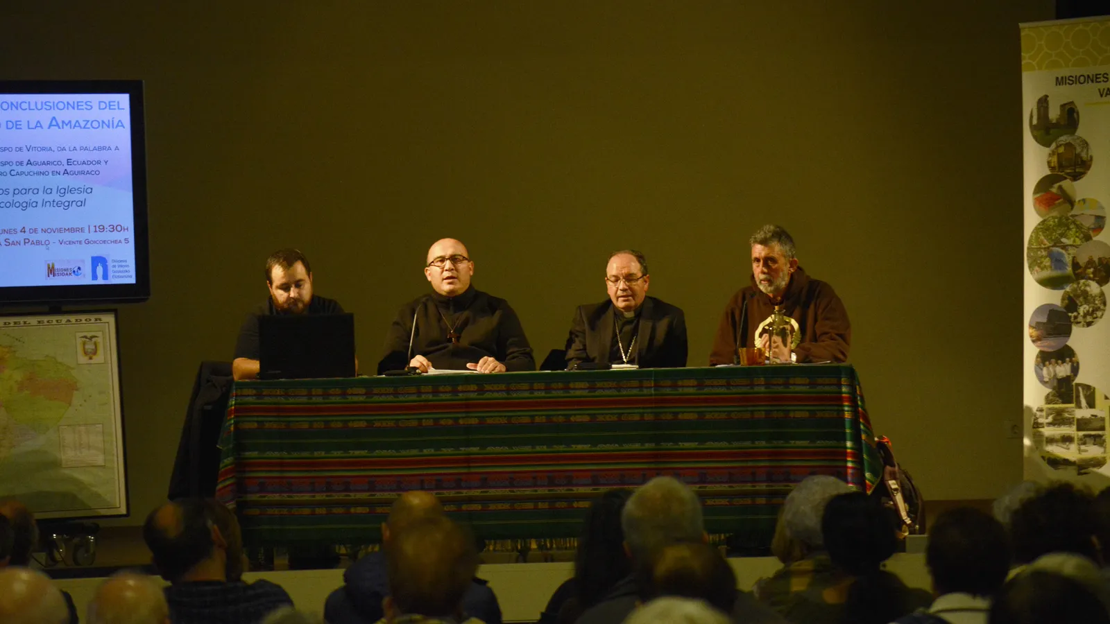 Aprovechando su paso por Vitoria, y antes de ofrecer su testimonio, pude entrevistar a Monseñor Adalberto Jiménez, quien el pasado 6 de octubre cumplía dos años como obispo del Vicariato apostólico de Aguarico, en Ecuador. Junto a él, otro franciscano capuchino, natural de navarra, Txarly Azcona, que trabaja en la selva amazónica ecuatoriana. Txarly fue uno de los religiosos que vivieron la gestación de la REPAM, Red Eclesial de la PanAmazonía.