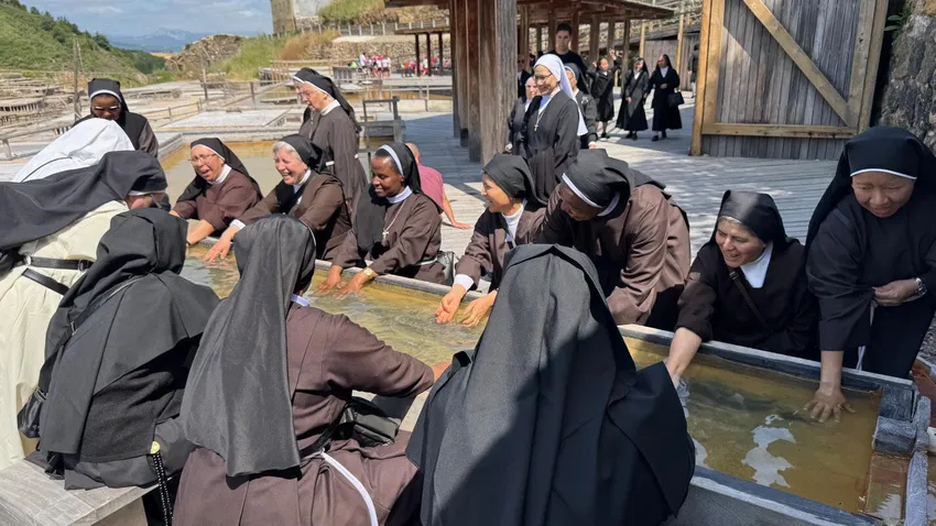Tras la Jornada Pro Orántibus, en el marco de la fiesta de la Santísima Trinidad, que celebra la Vida Contemplativa la Diócesis de Vitoria ha convocado a las seis órdenes religiosas presentes en la Diócesis, Clarisas, Salesas, Agustinas, Comendadoras, Carmelitas y Dominicas a ganar el Jubileo de la Esperanza con una excursión a la zona de Valdegovía. El destino era el Santuario de Ntra. Sra. de Angosto donde han tenido la celebración y la comida en la Casa de Espiritualidad de los P.P. Pasionistas. Pero antes han hecho una parada en Salinas de Añana, donde han podido disfrutar de la visita turística guiada a las salinas milenarias, y aprovechar los beneficios de las aguas salinas que se ofrecen en este recinto recuperado para la producción de sal y el turismo.