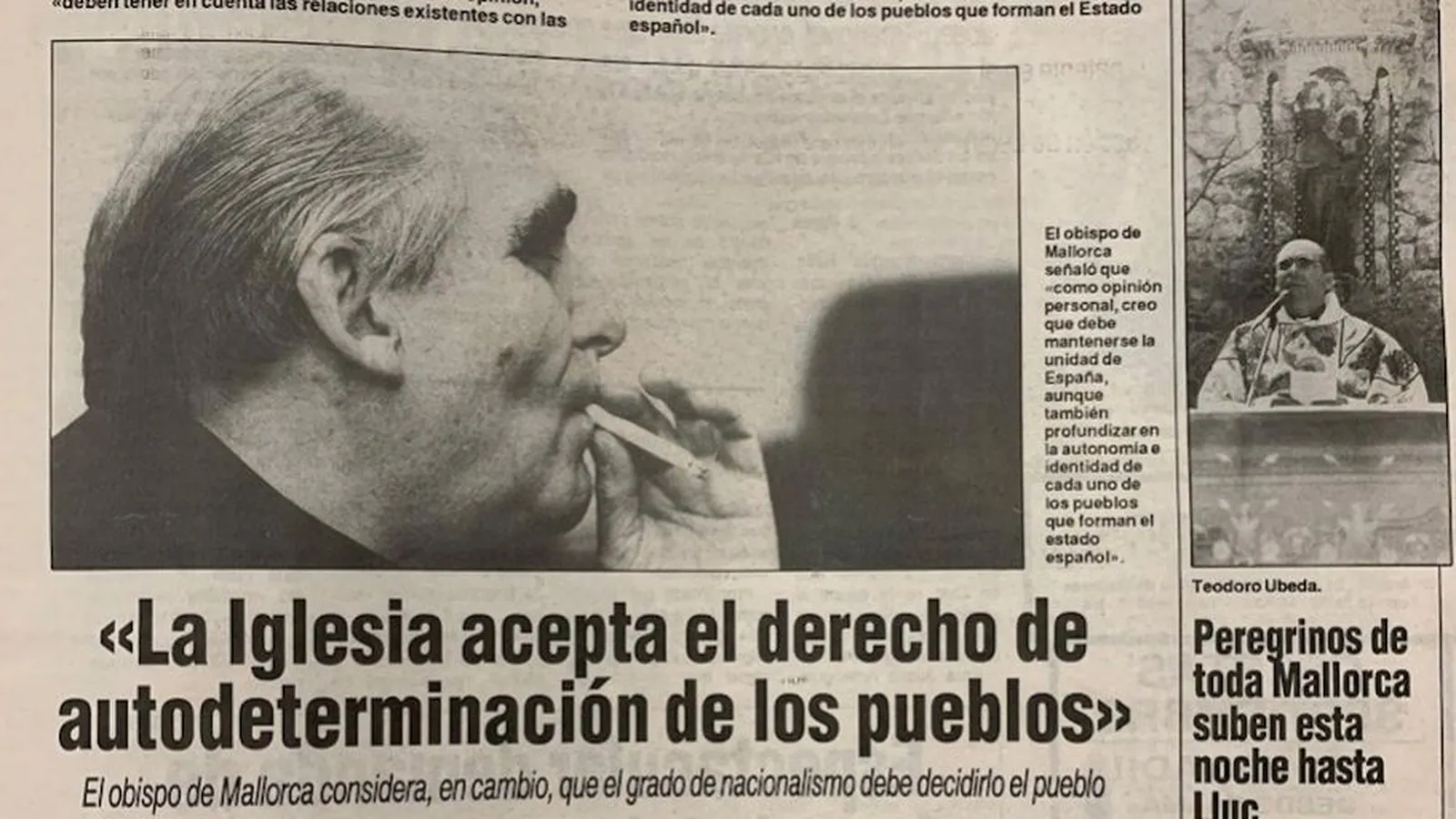 Estas son las declaraciones que el obispo Teodor Úbeda, de Mallorca, hizo al diario Baleares el 7 de septiembre de 1991. El obispo Teodor decía que “el derecho de autodeterminación de los pueblos es una doctrina incluida en el Concilio Vaticano II y, en consecuencia, aceptada y defendida por la Iglesia”. El obispo Teodor añadía aun que “la fórmula política” para “concretar el grado, la manera y los condicionamientos de nacionalismo, es una cosa que ha de decidir el conjunto de la sociedad de cada pueblo, en la cual la Iglesia es solo una voz más”.