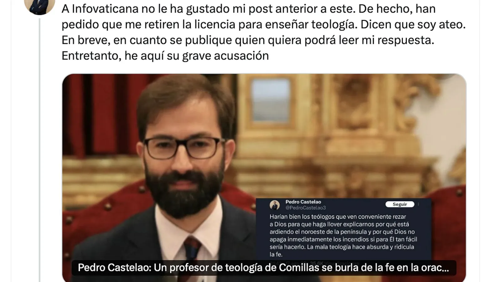 Infovaticana dice —pues nadie firma con su nombre la noticia— que me «he permitido el lujo de burlarme públicamente de la oración cristiana». Dicen que ridiculicé «a quienes rezan a Dios para pedir lluvia o el fin de los incendios». Añaden que me río «de la plegaria cristiana», que no tengo fe, que soy ateo, que sólo trabajo por dinero, que no debo seguir enseñando y que me deben echar de mi trabajo «porque no se puede tolerar que un profesor de teología ridiculice la oración cristiana y siga formando a futuros sacerdotes o teólogos».