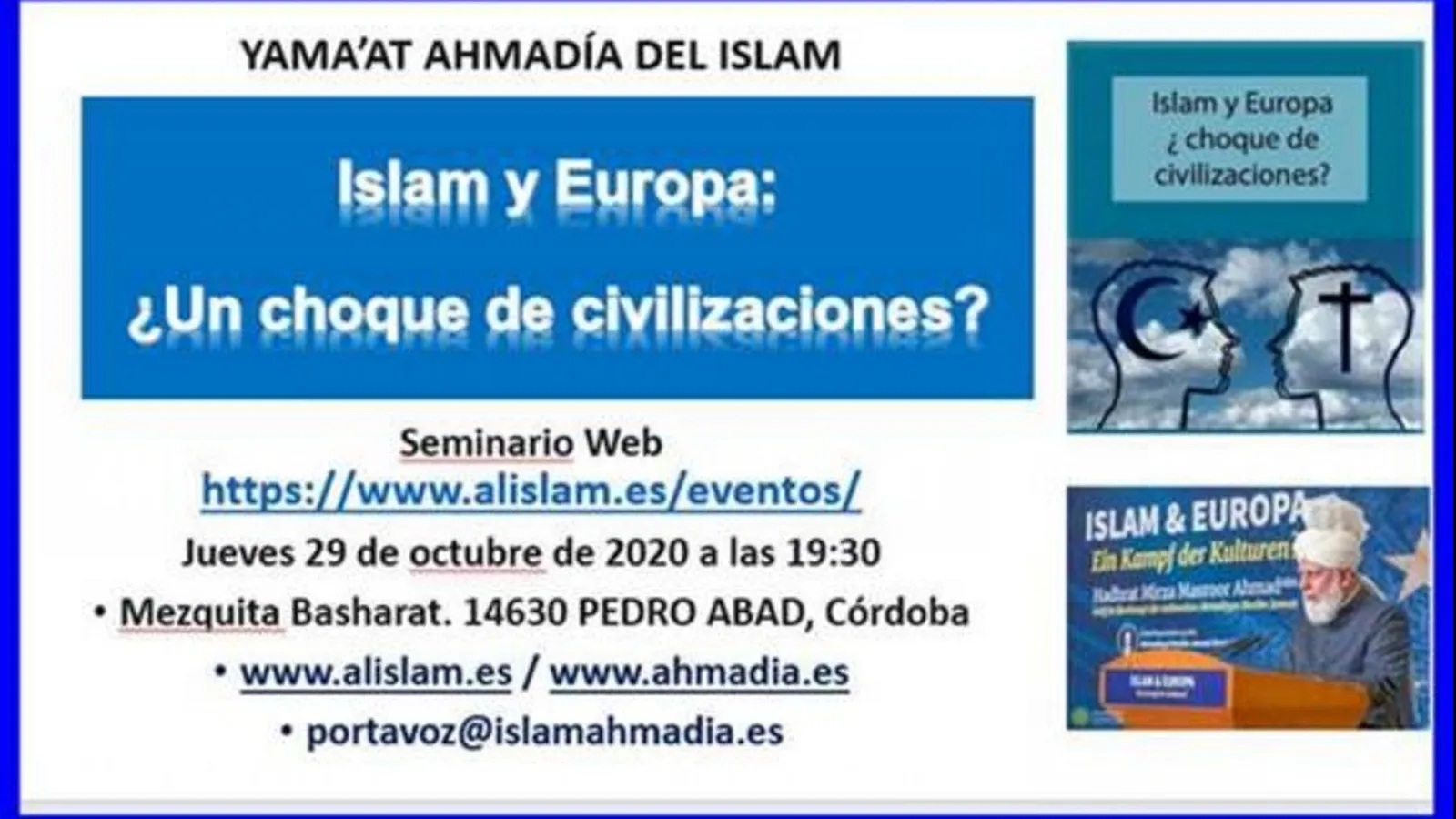 (Pueden participar gratuitamente en el seminario web: “Islam y Europa: ¿Un choque de civilizaciones?” que se celebrará el jueves 29 de octubre de 2020 a las 19:30. Inscripción:https://www.alislam.es/eventos/).