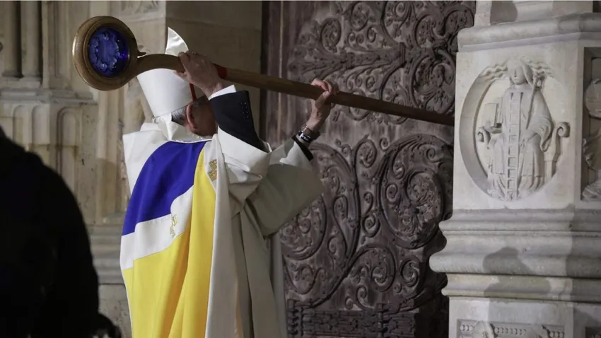 Varios momentos álgidos en la ceremonia. El primero, cuando el arzobispo Ulrich golpeó con su báculo de madera con una esfera azul resplandeciente en su cabecera por tres veces la puerta de la catedral y pidió que se abriese.