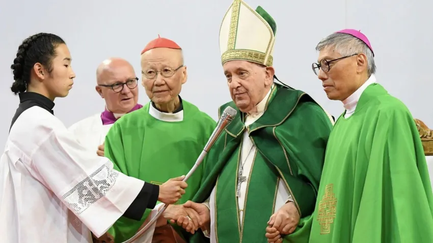 Y Francisco sigue mandando ‘recados’ a China. Esta vez desde la vecina Mongolia. Y por eso, al final de la misa, el Papa volvió a sorprender con uno de sus gestos proféticos, que valen más que mil palabras. Llamó a su lado a los dos arzobispos (el emérito, cardenal Tong, y el actual, de Hong Kong, el cardenal designado Stephen Chow Sauyan, les cogió de la mano y dijo a los presentes y a los televidentes de todo el mundo: